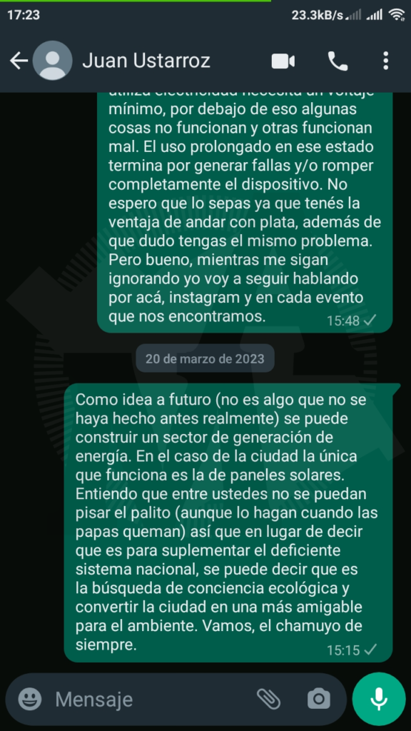 Yo muy amablemente me comuniqué con el intendente, brevemente le expliqué todo lo anterior e incluso le mandé videos mostrandole el pésimo estado y como trabajar así era imposible. También le propuse una solución que se me ocurrió de forma rápida, algo como para iniciar una conversación que busque una forma de amenar el problema al menos.